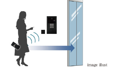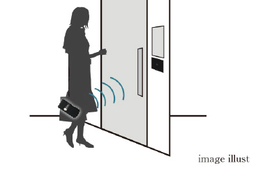 Tebraキーを携帯していれば、センサーの認証範囲に入ることでオートロックオートドアが解錠されます。※認証範囲はセンサーより約1.3〜1.8mです。エントランスに入るオートロックオートドアのみハンズフリー対応になります。
